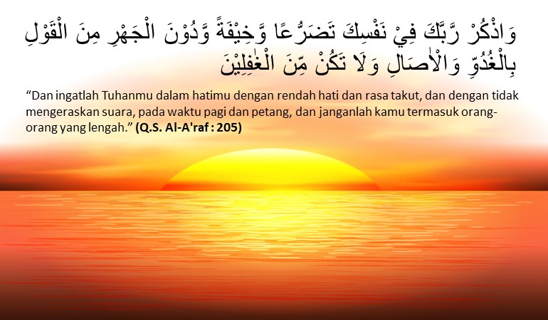 | "Dan sebutlah (nama) Rabb -mu dalam hatimu dengan merendahkan diri dan rasa takut dan dengan tidak mengeraskan suara diwaktu pagi dan petang dan janganlah kamu termasuk orang-orang yang lalai."(Q.S. Al-A'raf : 205) | ||