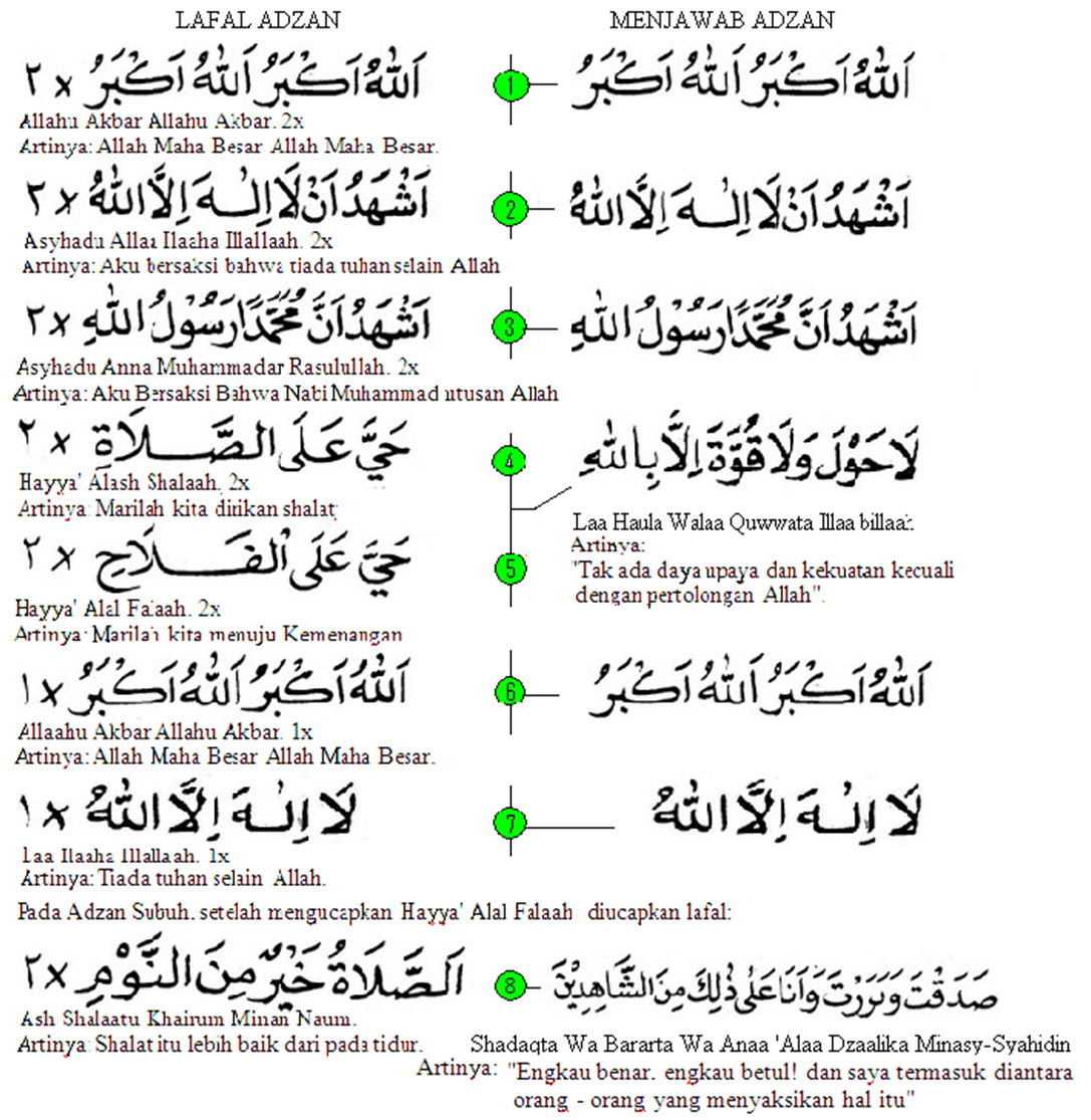 b.Apabila muazin mengucapkan "Hayya alash-shalah" atau "Hayya alal-falah", disunahkan menjawabnya dengan lafal “La haula wa la quwwata illa billahil 'aliyyil 'azhim " yang artinya "Tiada daya dan tiada kekuatan kecuali dengan pertolongan Allah".